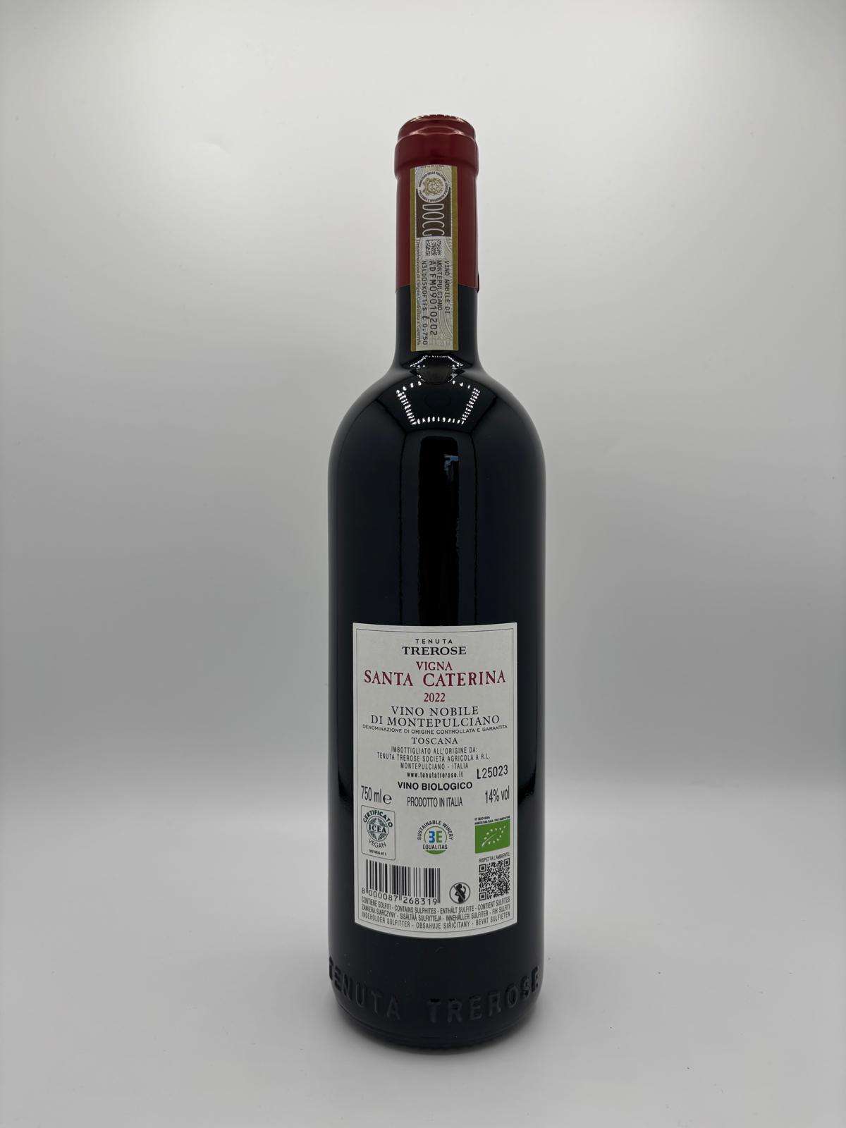 Il Vigna Santa Caterina della Tenuta Trerose è un vino di straordinaria eleganza e profondità, espressione autentica del territorio di Montepulciano. Ottenuto da uve Sangiovese in purezza (Prugnolo Gentile) provenienti da una singola vigna storica esposta a sud-est, rappresenta la massima interpretazione del Vino Nobile di Montepulciano DOCG della cantina. La fermentazione avviene in acciaio a temperatura controllata con lunghe macerazioni sulle bucce, seguita da un affinamento in botti grandi di rovere e tonneaux per diversi mesi, a cui si aggiunge un ulteriore periodo in bottiglia per permettere al vino di raggiungere equilibrio e armonia.